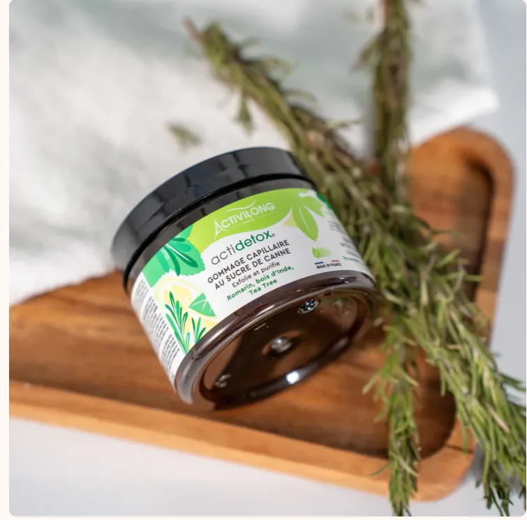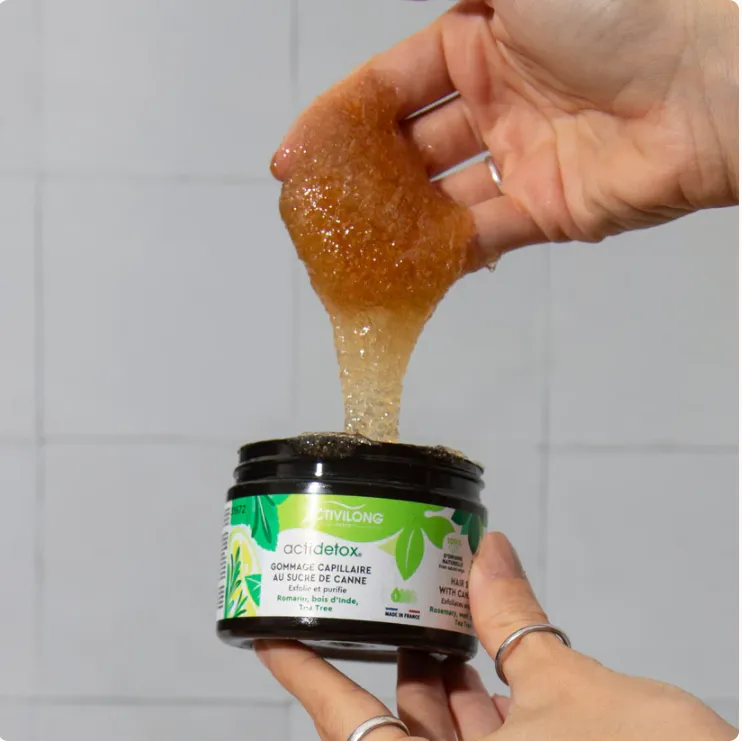 Exfoliante capilar Actidetox con azúcar de caña 100 % natural que purifica suavemente el cuero cabelludo. Enriquecido con romero, madera de la India y árbol de té, se transforma en leche al enjuagar. Deja el cuero cabelludo fresco, limpio y revitalizado.
