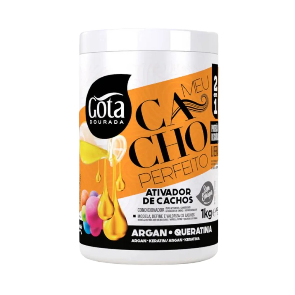 Gota Dourada Meu Cacho Perfeito Activador 1kg con aceite de argán y queratina fortalece e hidrata los rizos. Define y potencia la forma natural del cabello rizado sin apelmazar. Ideal para mantener rizos suaves, brillantes y con movimiento.