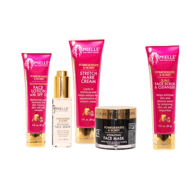 Nuestra colección de cuidado de la piel de granada y miel está formulada para ayudar a exfoliar, tensar y purificar la piel mientras limpia, hidrata y refina suavemente. Nuestra colección se enfoca en los problemas comunes de la piel que van desde la sequedad y la opacidad hasta las estrías y más, ¡todo mientras utiliza el poder natural de ingredientes exuberantes como la granada y la miel! El cuidado de la piel saludable no tiene por qué romper el banco, y nuestra colección de cuidado de la piel de granada y miel es una experiencia de spa lujosa con un precio que le encantará.