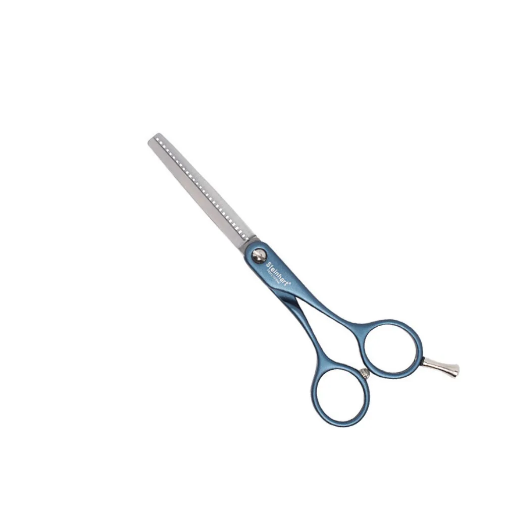 Tijera de esculpir Steinhart con funda protectora, diseñada para eliminar peso y texturizar el cabello con precisión. Mango ergonómico y filo duradero para cortes suaves y controlados.