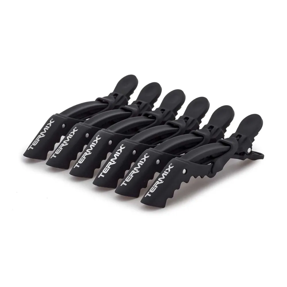 Set de 6 pinzas profesionales Soft Touch de Termix, diseñadas para sujetar grandes secciones de cabello con máxima fijación. Ideales para peinados y particiones precisas en salones profesionales.